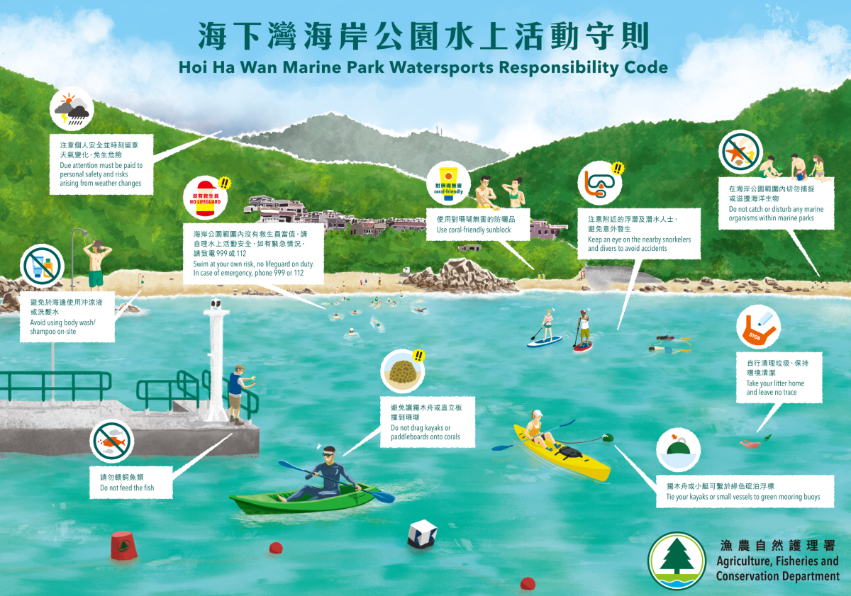 漁護署已跟世界自然基金會香港分會(WWF)合作,每日安排2名浮潛嚮導及3名獨木舟嚮導在近岸水域巡邏,提醒浮潛旅客遵循珊瑚友善路線上落水,避免踩踏珊瑚,並引導訪客前往人流較少區域,每小時以無人機定時監察訪客活動及海岸情況,靈活調配人手跟進。