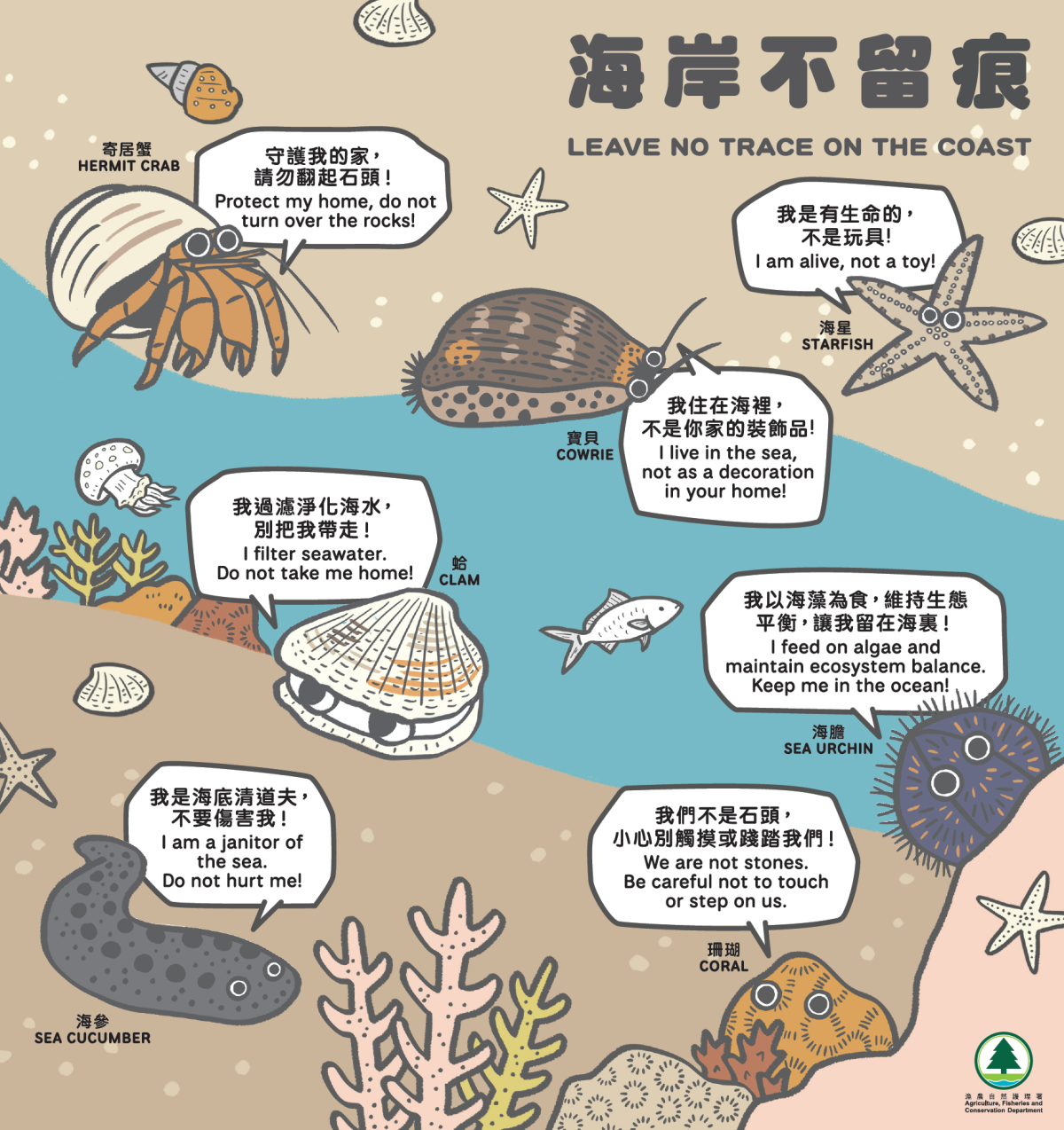 切勿撿取活生或已死的海洋生物及其部分,建議使用相機或攝錄機記錄。