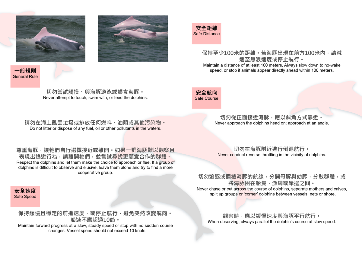 安全距離:保持至少100米的距離。若海豚出現在前方100米內,請減速至無浪速度或停止航行。