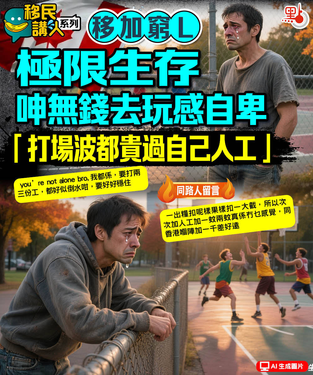 【點新聞報道】加拿大生活成本高昂,有移民加拿大的港人在網上大呻手停就口停,指自己幾年來都是搵廿蚊一個鐘、無家底、無技能,除咗返工,放假都無閒錢玩,直指「打場波都貴過自己人工」。