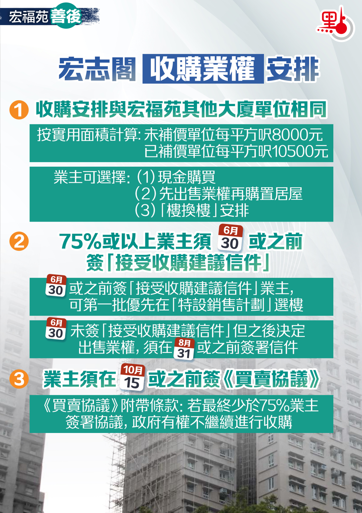 黃偉綸表示,在6月30日或之前簽署「接受收購建議信件」的宏志閣業主,可以第一批優先在「特設銷售計劃」選樓。至於未在6月30日或之前簽署「接受收購建議信件」,但之後決定出售業權的宏志閣業主,則必須在8月31日或之前簽署「接受收購建議信件」。所有接受政府收購的宏志閣業主,必須在10月15日或之前簽署《買賣協議》,政府在協議中加入條款,若最終簽署《買賣協議》的業主不足75%,政府有權選擇不繼續進行有關收購。