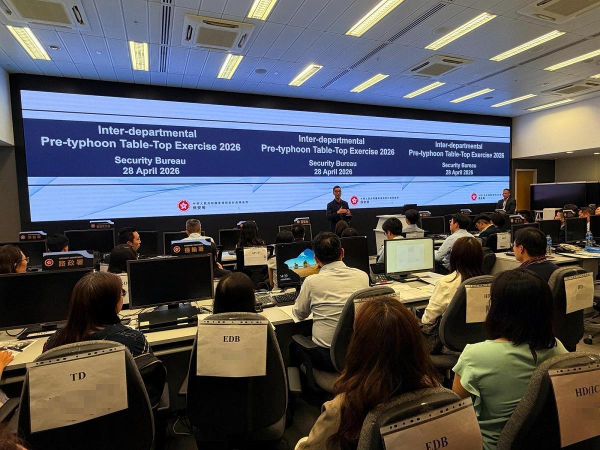 保安局今日(28日)在政府總部的緊急事故監察及支援中心舉行颱風前跨部門桌面演習,藉此加強各政策局、部門及其他相關機構的應變和協作,以應對超強颱風及/或暴雨襲港時可能出現的緊急情況。
