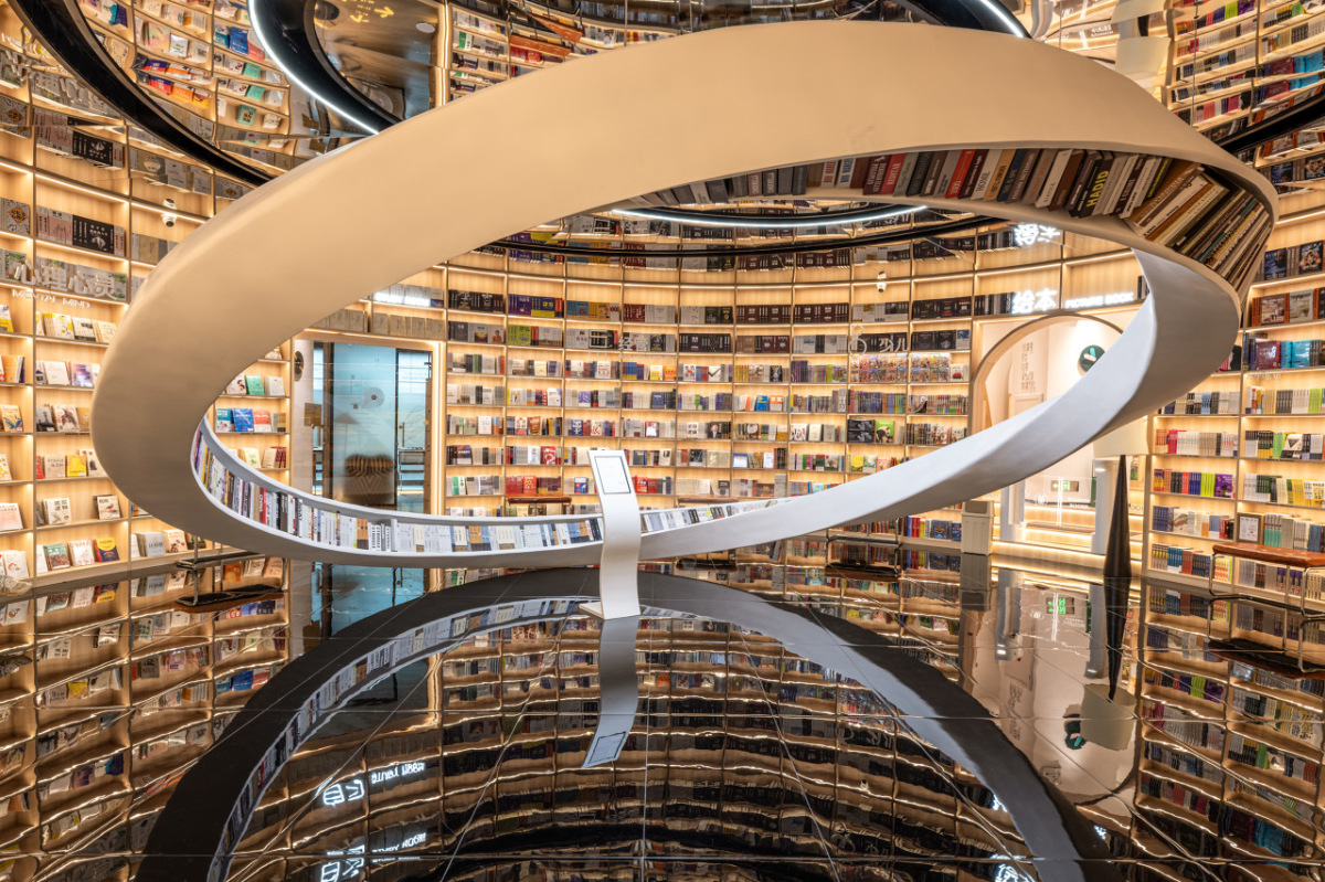 愈欣書店於深圳設有多家分店,其中龍華印象匯店以其獨特的設計而聞名。書店內部採用了「莫比烏斯環」作為設計靈感,充滿未來科技感。設計師巧妙地利用地面與天花板的鏡面反射,配合環形交錯的書架,營造出科幻片般的超現實場景,為讀者帶來獨一無二的視覺體驗。