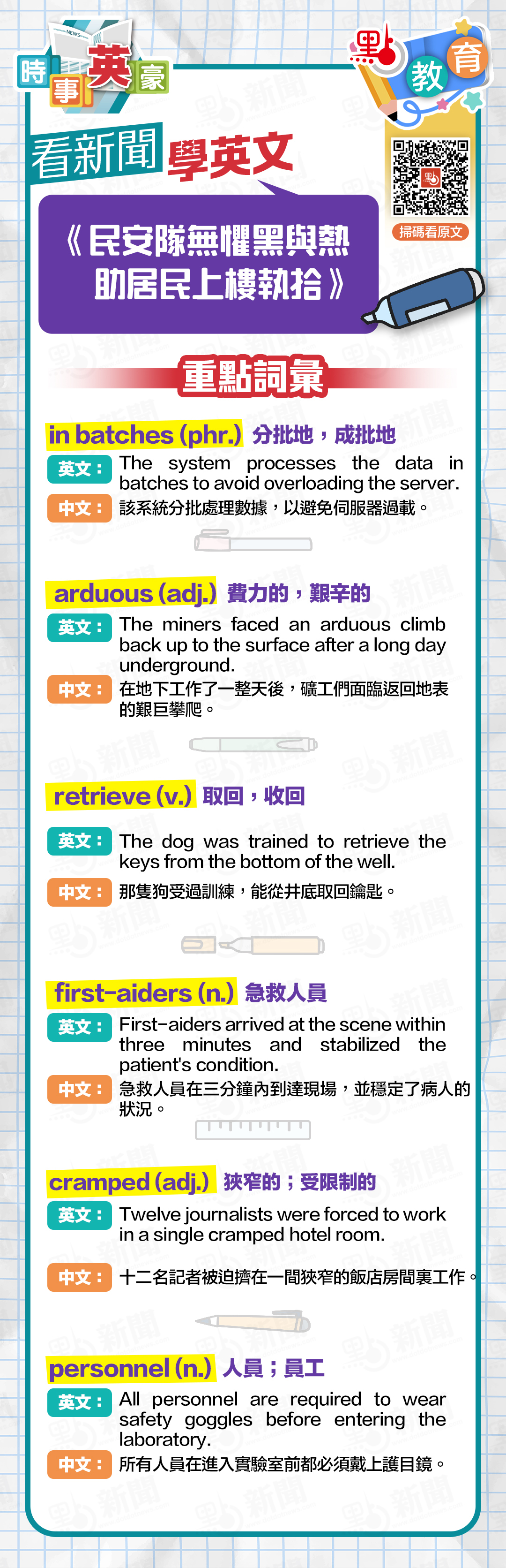 香港文匯報專訪多位參與行動的民安處及民安隊成員分享這項艱辛任務的點滴,過去一周多,隊員每天長達13小時守護居民,在漆黑、悶熱的樓層間上落奔走,只為協助居民安全返回單位,順利帶走珍視之物。