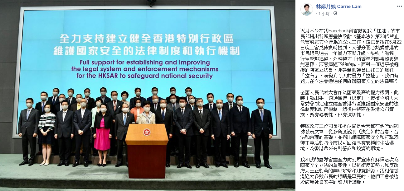 行政長官林鄭月娥今日(24日)在社交專頁發文,指全國人民代表大會作為國家最高的權力機關,此時主動出手,授權全國人大常委會制定香港特區維護國家安全的法律制度和執行機制,在香港公佈實施,是有必要性及迫切性。