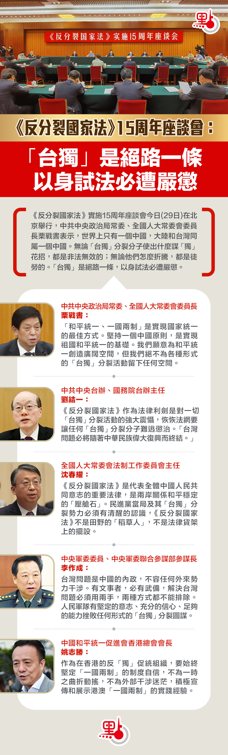 《反分裂國家法》15周年座談會今日(29日)在北京舉行。中共中央政治局常委、全國人大常委會委員長栗戰書表示,世界上只有一個中國,大陸和台灣同屬一個中國。無論「台獨」分裂分子使出什麼謀「獨」花招,都是非法無效的;無論他們怎麼折騰,都是徒勞的;無論他們與外國勢力如何勾連表演,都無法改變台灣是中國一部分的歷史和法理事實。「台獨」是絕路一條,以身試法必遭嚴懲。