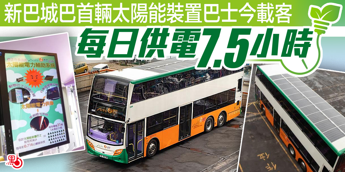 新巴城巴旗下首輛太陽能裝置雙層巴士,今日(5日)起投入服務。巴士車頂的太陽能板能為巴士車廂的照明系統及乘客資訊設施供電,估計每年可減少0.716公噸碳排放量,相等於種植31棵5米高大樹為社區空氣淨化。