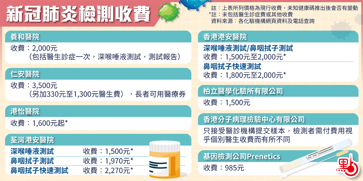 隨着粵港澳三地新冠肺炎疫情漸見穩定,三地政府正積極研究恢復人員及經貿往來。據悉,特區政府最快於周內推出「港版健康碼」制度,讓通過新冠病毒檢測的入境者豁免14天檢疫。本港現階段有8間認可檢測機構,包括5間私家醫院,分別是養和醫院、仁安醫院、港怡醫院,以及荃灣港安和香港港安醫院,另有3間私營化驗所,分別是栢立醫學化驗所有限公司、香港分子病理檢驗中心有限公司,以及基因檢測公司Prenetics。