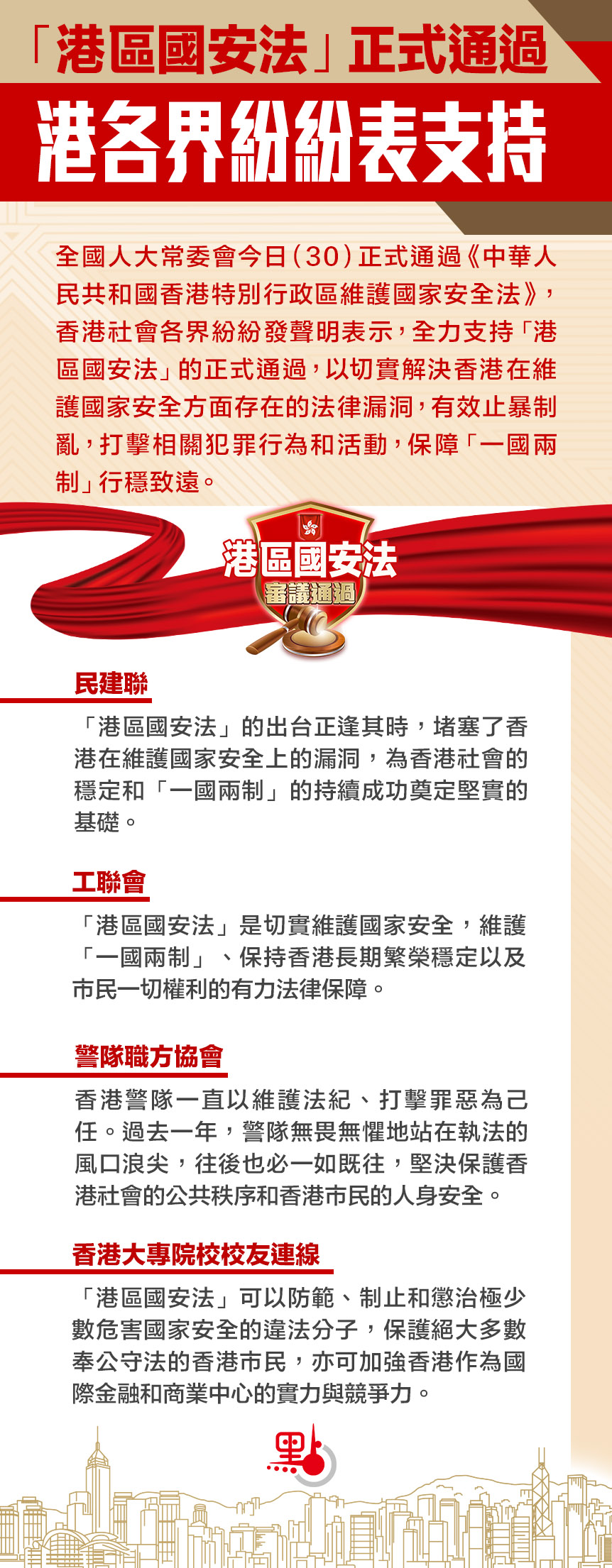 全國人大常委會今日(30)正式通過《中華人民共和國香港特別行政區維護國家安全法》,香港社會各界紛紛發聲明,表示全力支持「港區國安法」的正式通過,以切實解決香港在維護國家安全方面存在的法律漏洞,有效止暴制亂,打擊相關犯罪行為和活動,保障「一國兩制」行穩致遠。
