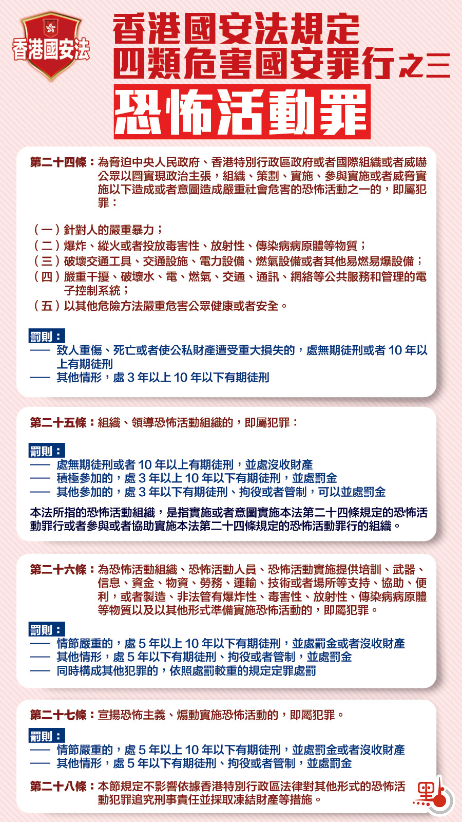 香港國安法明確規定四類危害國家安全的罪行,其中恐怖活動罪是指,為脅迫中央政府、香港特區政府或者國際組織或者威嚇公眾以圖實現政治主張,組織、策劃、實施、參與實施或者威脅實施造成或者意圖造成嚴重社會危害的恐怖活動;為恐怖活動提供培訓、武器、信息、資金、物資、勞務、運輸、技術或者場所等支持、協助、便利,或者製造、非法管有爆炸性、毒害性、放射性、傳染病病原體等物質以及以其他形式準備實施恐怖活動;還包括宣揚恐怖主義、煽動實施恐怖活動。