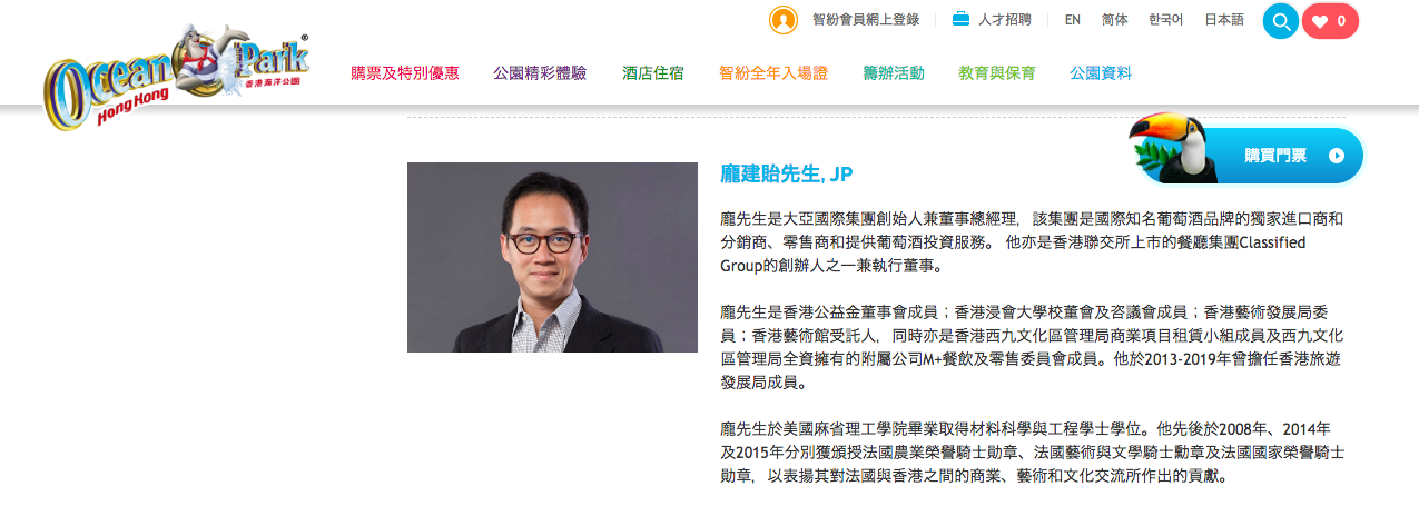 商務及經濟發展局發言人指,龐建貽自去年加入海洋公園公司董事局,擁有豐富的商界經驗,對海洋公園的發展充滿熱誠,是擔任新副主席的最佳人選。