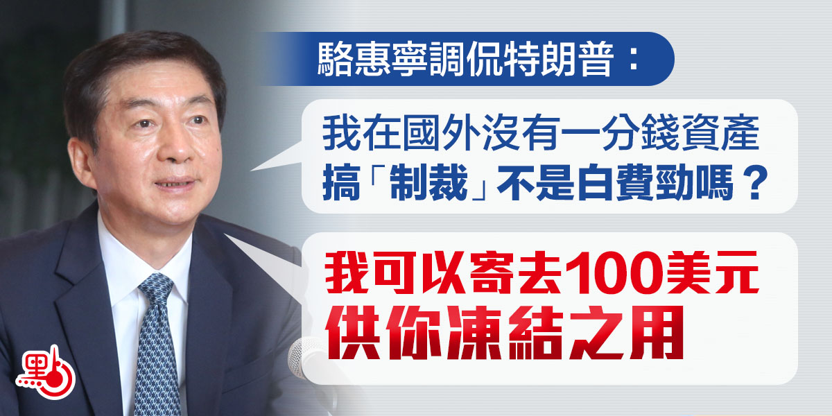 駱惠寧表示,「被美國列入制裁名單,恰恰說明我為國家、為香港做了我應該做的事情。我在國外沒有一分錢資產,搞『制裁』不是白費勁嗎?當然,我也可以向特朗普先生寄去100美元,以供其凍結之用。」