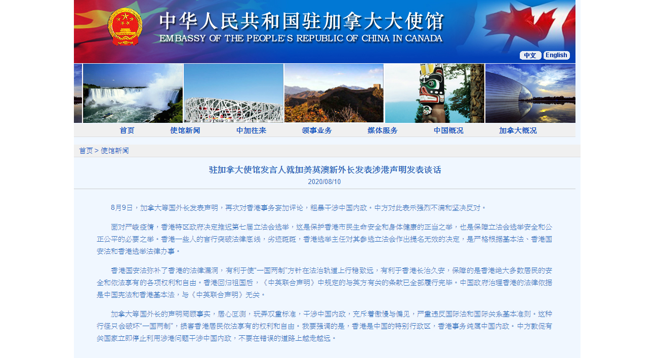 中國駐加使館對五眼聯盟涉港聲明 表示堅決反對