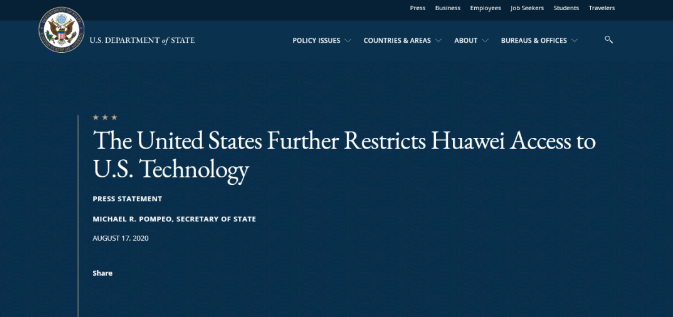 據環球網援引俄羅斯衛星通訊社最新消息,在美國國務院官網發布的聲明中,蓬佩奧稱,「國務院強烈支持商務部今天擴大其外國直接產品規則,這將阻止華為通過『替代芯片生產』與『提供用從美國獲得的工具生產的現成芯片』來規避美國法律。」