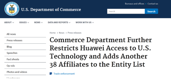 美國將38家華為子公司列入「實體清單」