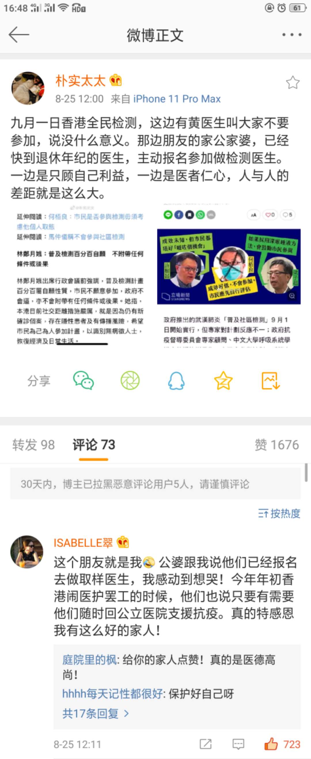 「樸實太太」還在社交媒體上PO出截圖,支持林鄭,直斥所謂專家醫生抹黑普及檢測目的是政治計算。香港網友紛紛留言表支持:「我都唔明,做個檢測有幾難?對自己好,亦對身人好,點解唔做?何柏良身為一個傳染病專家講出這種話真是給香港醫生丟臉,再一次的!」還有網友稱讚「SABELLE翠」的公婆「醫德高尚」、「好人有好報」,並暖心留言「要保護好自己」。