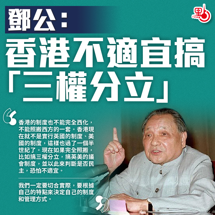 鄧小平同志1987年4月在會見香港基本法起草委員會委員時,強調香港不能照搬西方的一套,不適宜搞「三權分立」。鄧公明確表示:「香港的制度也不能完全西化,不能照搬西方的一套。香港現在就不是實行英國的制度、美國的制度,這樣也過了一個半世紀了。現在如果完全照搬,比如搞三權分立,搞英美的議會制度,並以此來判斷是否民主,恐怕不適宜。」「我們一定要切合實際,要根據自己的特點來決定自己的制度和管理方式。」