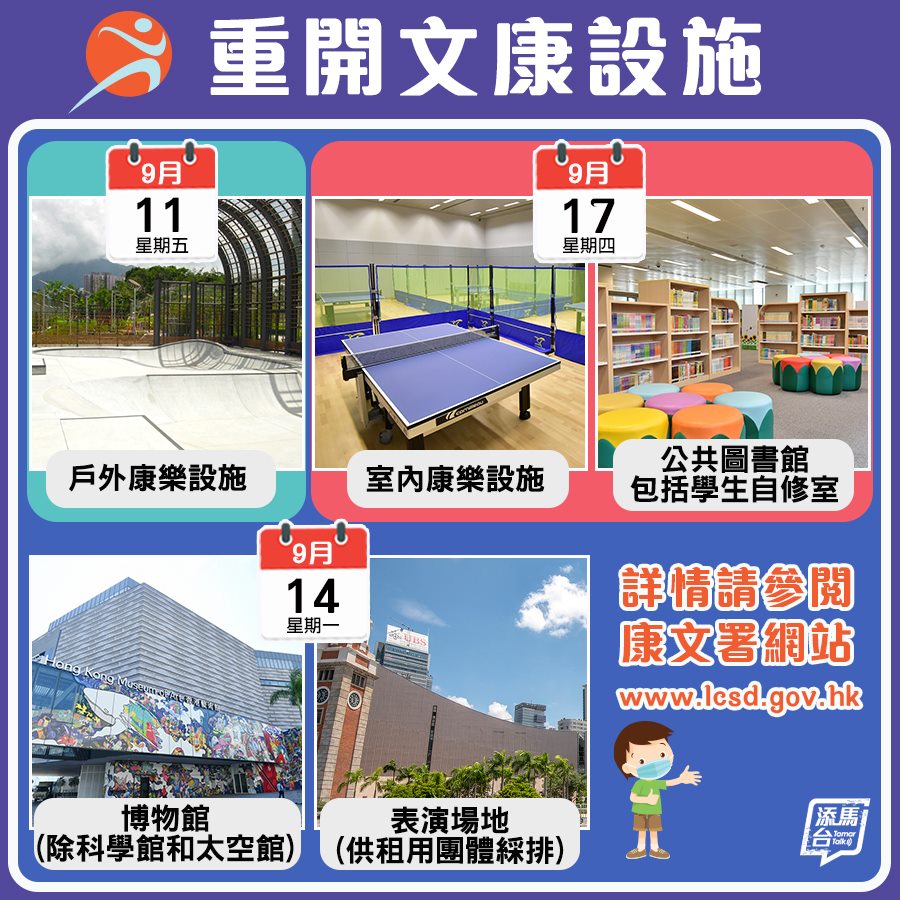 除科學館和太空館外,康文署博物館由下周一(14日)起將重新開放展覽設施,所有互動式展品、公眾節目及兒童設施暫停,所有博物館每日將由上午10時開放至下午5時,並限制參觀人數,藝術館、文化博物館及歷史博物館將採取分段式入場。香港中央圖書館、6間主要圖書館及31間分區圖書館,由下周四起重開,學生自修室同樣重開,並實施特別開放時間。