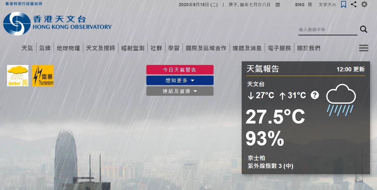 天文台今日(15日)中午12時10分發出黃色暴雨警告信號。