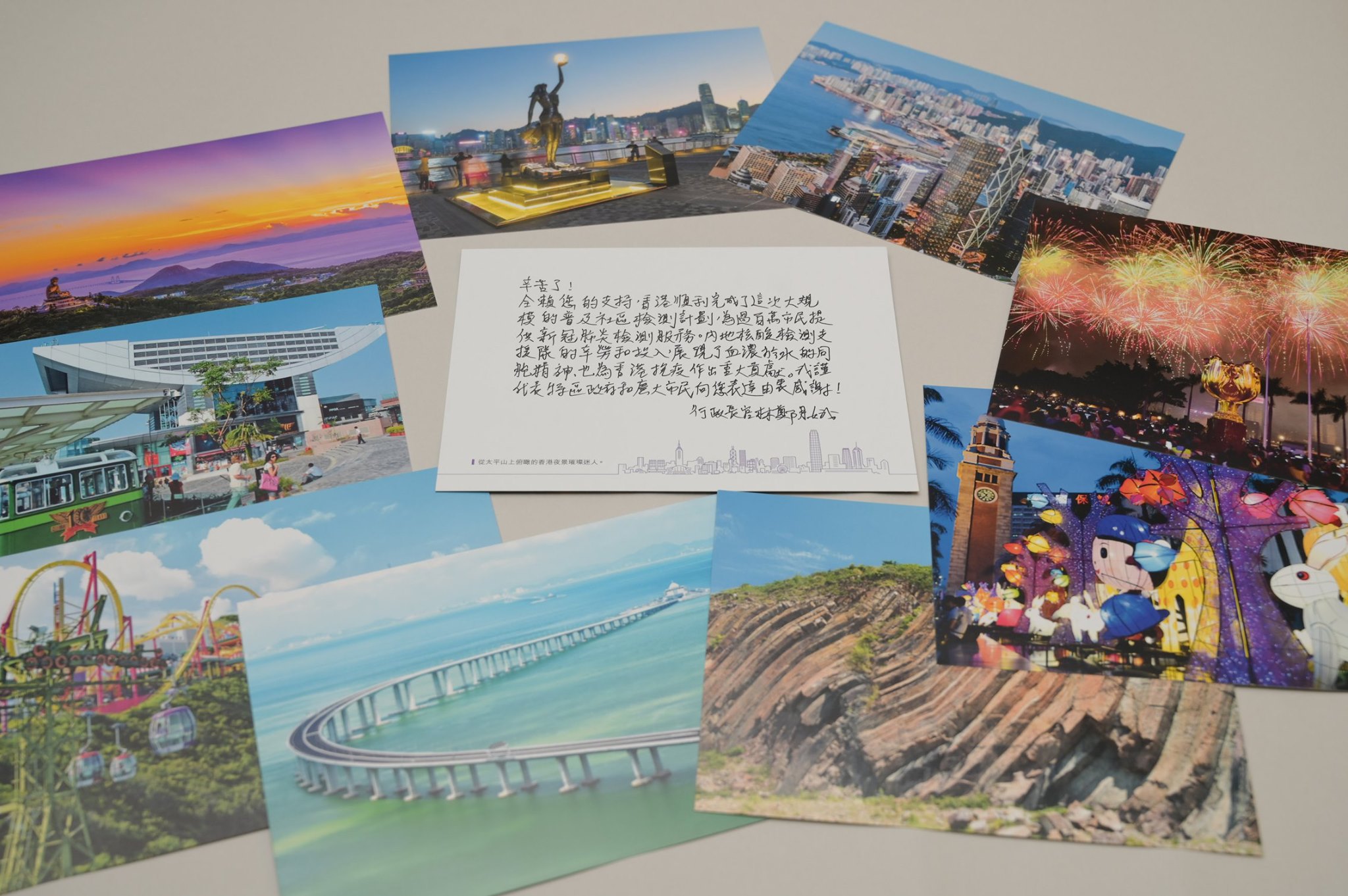 為期14日的普及社區檢測計劃昨日(14日)已圓滿結束,累計約178.3萬人參與。特區政府今日(15日)為內地核酸檢測支援隊舉行歡送儀式。林鄭月娥今晚在社交媒體發文指,為表謝意,特區政府為支援隊每位成員準備了一個小禮包,包括一些香港景色的明信片。希望待疫情過去,他們可與家人到香港旅遊,特區政府也可一盡地主之誼。