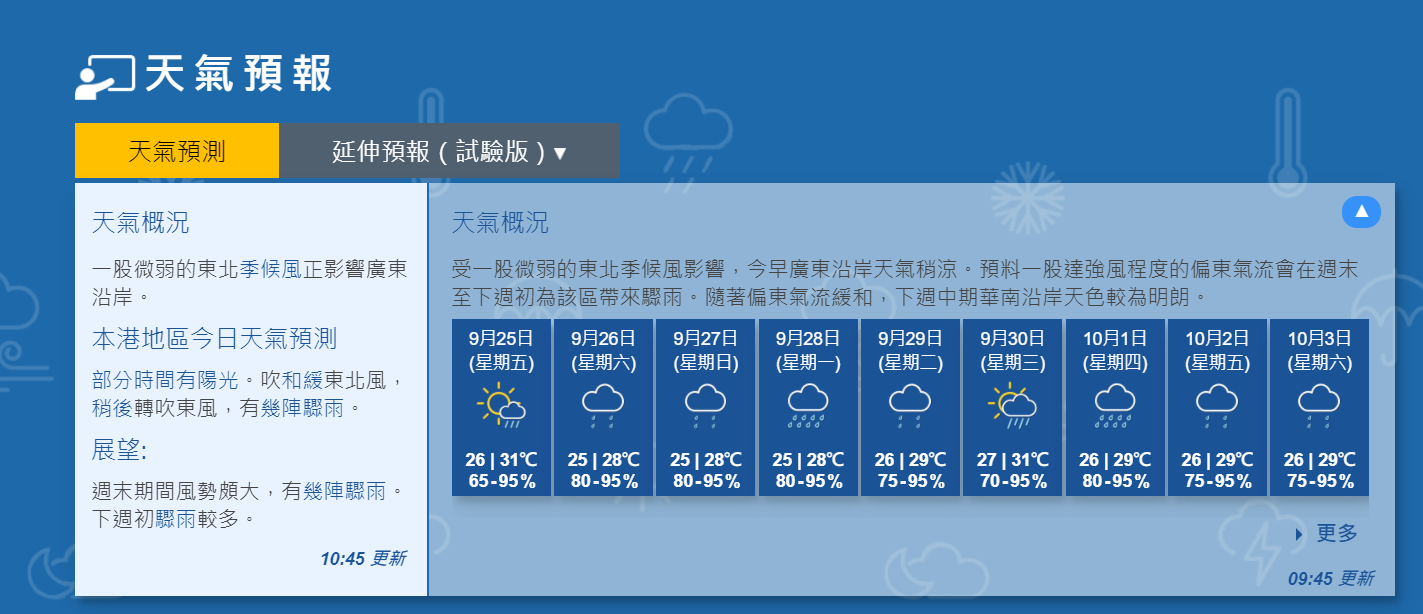 一股微弱的東北季候風正影響廣東沿岸,天文台預測,今日本港部分時間有陽光,最高氣溫約31度,吹和緩東北風,稍後轉吹東風,有幾陣驟雨,局部地區有雷暴。展望周末期間風勢頗大,有幾陣驟雨,下周初驟雨較多。