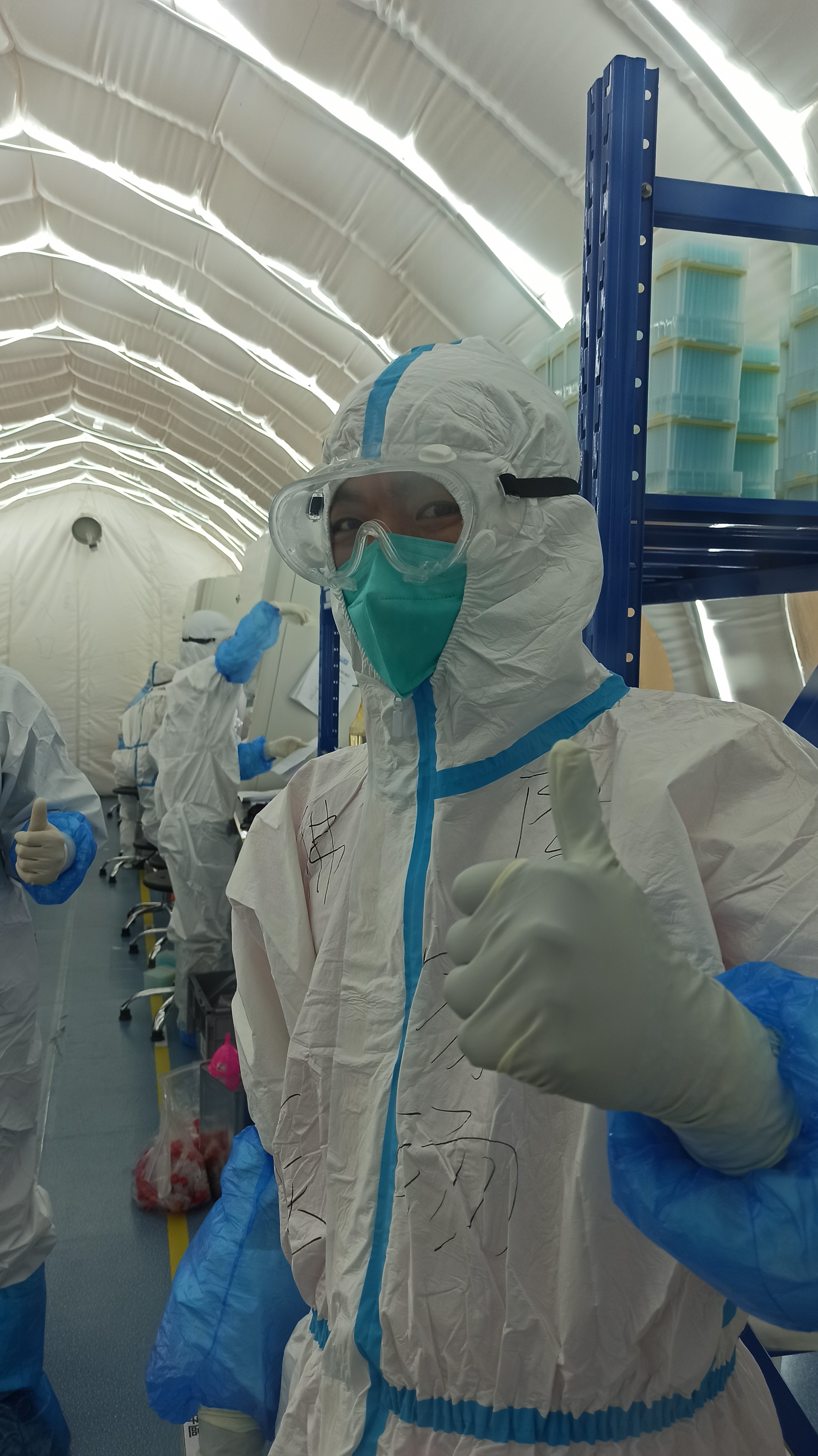 工作期間,連續奮鬥了5個12小時的長夜班,面對高強度的工作,有的隊員手指由於長時間機械性運動受傷,有的隊員由於長時間帶防護鏡眼睛疼痛,很多隊員由於夜班休息不好,出現頭痛,到了後面很多隊員靠安眠藥來助眠。有些隊員是第一次經歷這麼高強度的工作,但是沒有一個隊員主動申請休息的。有的隊員眼睛痛受不了,讓他出去休息,他只休息了一會兒又穿上防護服回來繼續工作。有的隊員,在標本量較大的那幾天,兩天兩夜一共只睡了6-7個小時;大家吃飯時間都爭分奪秒,輪流出倉吃飯,吃飯也不停工;隊員們的努力,在實驗室的每一刻都讓我感動。