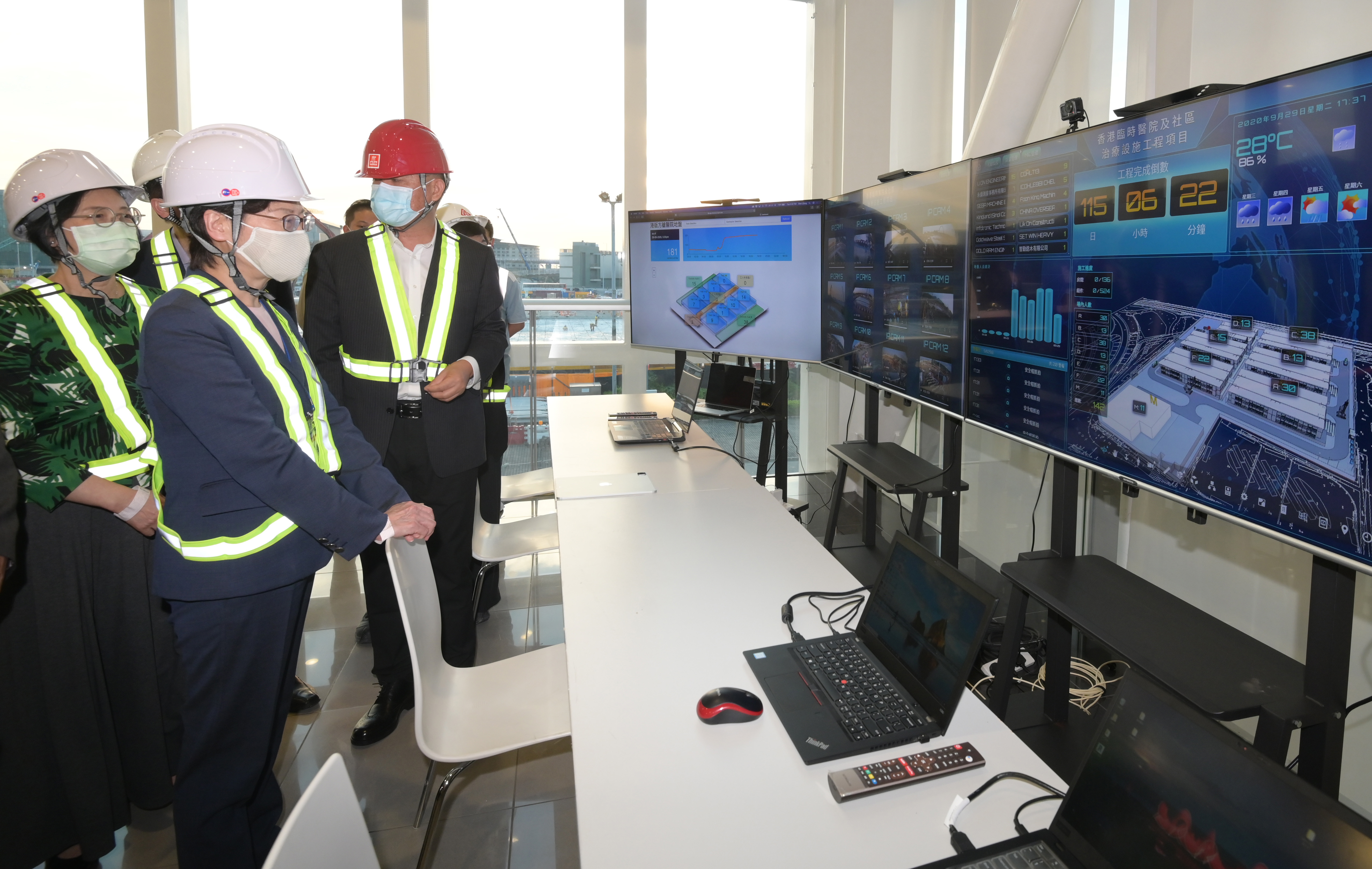 林鄭月娥一行其後轉到亞博館,建築署及承建商人員向她介紹位於亞博館旁的臨時醫院項目。該項目會採用「組裝合成」建築技術興建,以期在約4個月內建成,地盤現正進行前期工作。項目落成後提供可容納超過800張病床的負氣壓病房和相關醫療設施,將大大增加醫院管理局可提供的負壓病床數目。