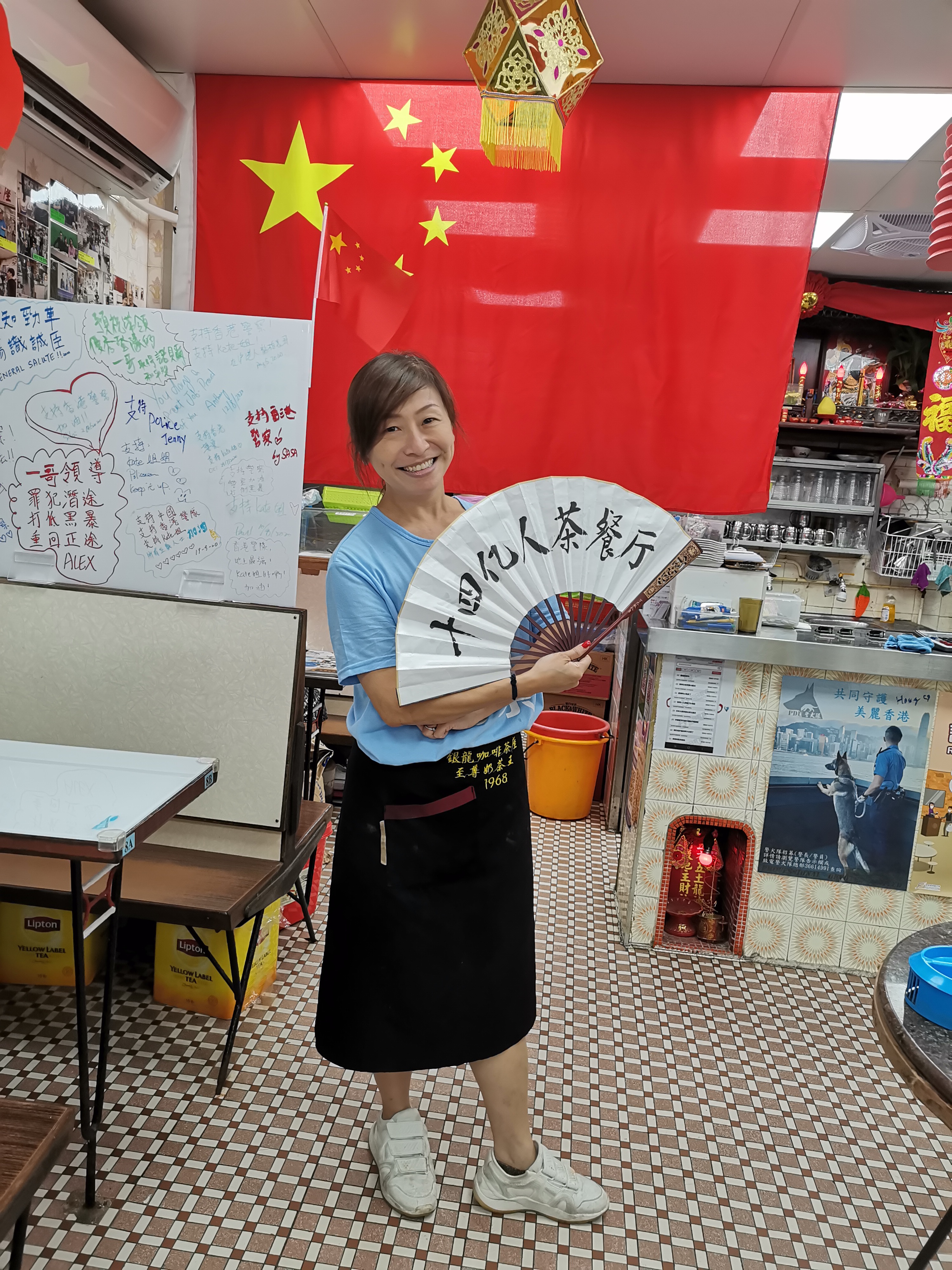 還記得那個「一人茶餐廳」撐警的老闆娘李凱瑚嗎?值此國慶中秋佳節,她是如何度過的?點新聞記者今日(3日)來到位於鯉魚門的銀龍咖啡茶座,只見店內掛着一面鮮艷的巨幅國旗,每張枱上面都插滿了國慶的小國旗,濃濃的節日喜慶氛圍撲面而來。老闆娘李凱瑚一邊笑盈盈地招待進店的顧客,一邊介紹這面巨幅國旗的故事。