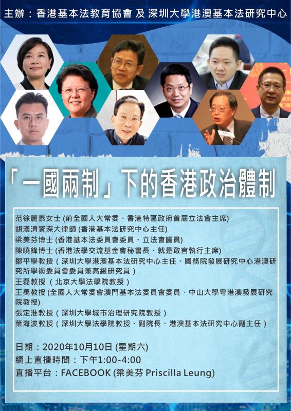 由基本法教育協會和深圳大學港澳基本法研究中心主辦的「『一國兩制』下的香港政治體制」研討會今日(10日)在線上召開。會議由立法會議員梁美芬主持,前立法會主席范徐麗泰、基本法研究中心主任胡漢清、法學交流基金會秘書長陳曉鋒、北京大學法學院教授王磊以及深圳大學港澳基本法研究中心主任鄒平學等應邀發言。