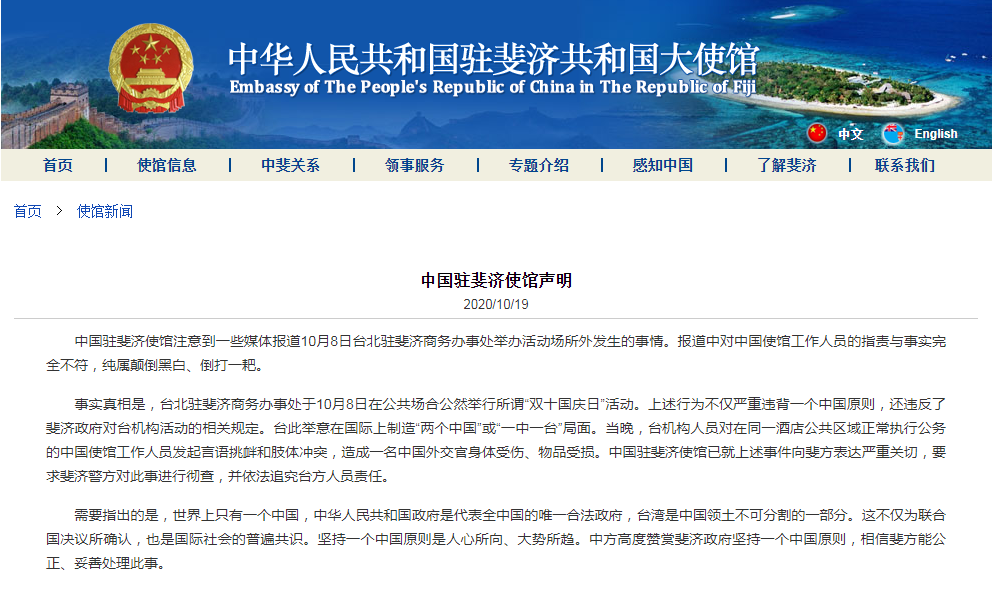 聲明指出,事實真相是,台北駐斐濟商務辦事處於10月8日在公共場合公然舉行所謂「雙十國慶日」活動。上述行為不僅嚴重違背一個中國原則,還違反了斐濟政府對台機構活動的相關規定。台此舉意在國際上製造「兩個中國」或「一中一台」局面。當晚,台機構人員對在同一酒店公共區域正常執行公務的中國使館工作人員發起言語挑釁和肢體衝突,造成一名中國外交官身體受傷、物品受損。中國駐斐濟使館已就上述事件向斐方表達嚴重關切,要求斐濟警方對此事進行徹查,並依法追究台方人員責任。