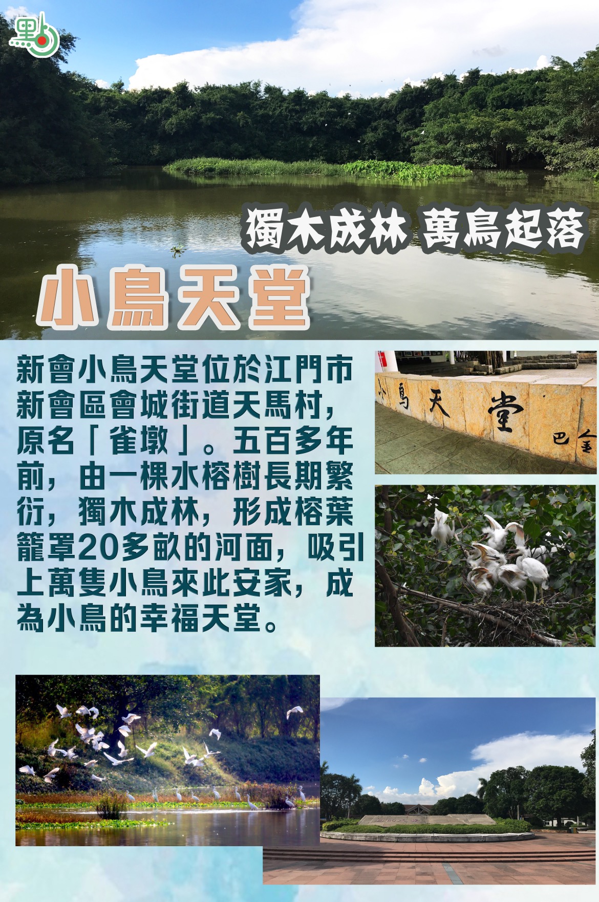 新會小鳥天堂位於江門市新會區會城街道天馬村,原名「雀墩」。五百多年前,由一棵水榕樹長期繁衍,獨木成林,形成婆娑的榕葉籠罩着20多畝的河面,吸引成千上萬隻小鳥來此安家,成為小鳥的幸福天堂。河流、泥墩、榕樹、魚和鳥形成了良性循環的生態系統,樹上棲鳥無數,鳥樹相依,人鳥相處,和諧奇特,是世間罕有的一道自然美麗風景線。