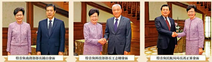 3.林鄭月娥在京分別與商務部、科技部及民航局領導會面,討論中央支持香港經濟的措施,她希望相關部門未來能繼續支持港企把握內地市場商機。