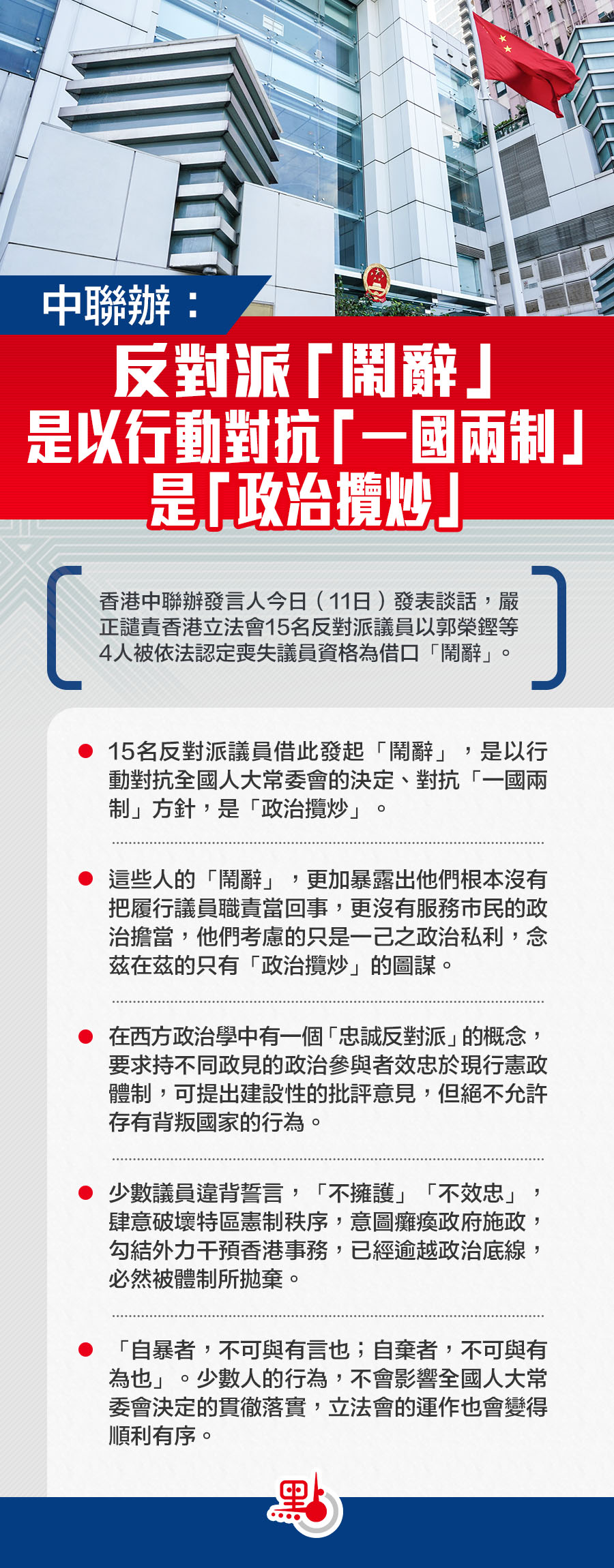 全國人大常委會今日(11日)通過有關香港立法會議員資格問題的決定,港府隨即宣布4名攬炒派議員楊岳橋、郭榮鏗、郭家麒和梁繼昌即時喪失議員資格,多名攬炒派議員亦於傍晚「鬧辭」。香港中聯辦發言人今日發表談話,嚴正譴責立法會15名反對派議員以郭榮鏗等4人被依法認定喪失議員資格為借口「鬧辭」。發言人強調,他們的「鬧辭」是以行動對抗全國人大常委會的決定、對抗「一國兩制」方針,是「政治攬炒」。