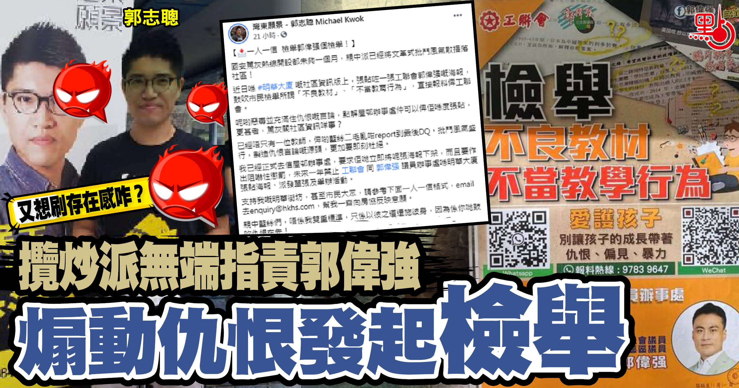 郭志聰在fb發帖聲稱,「國安篤灰熱線開設都未夠一個月,親中派已經將文革式批鬥風氣散播落社區」云云,又表示已經正式去信屋邨辦事處,要求立即將海報下架,而且要作出阻嚇性懲罰等,仲叫埋支持者一人一信去投訴對方。顯然,他才是煽動批鬥、仇恨的製造者。