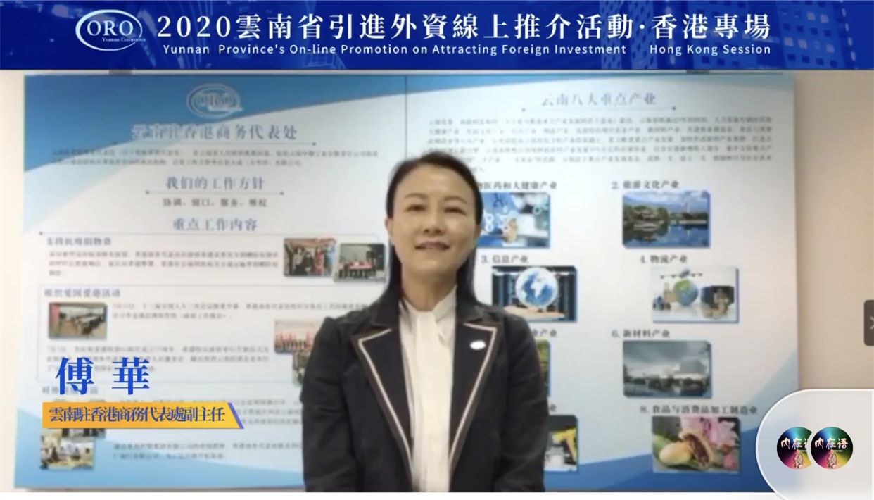 雲南駐香港商務代表處副主任傅華為直播做開場致辭。她表示,突如其來的新冠疫情打破了正常的工作計劃,創新的工作方式已成為新常態,滇港兩地積極探索常態化緊密型合作機制。香港是雲南省第一大外資來源地,如今雲南不斷優化營商環境,推動經濟高品質發展,香港各界對雲南發展的關注度也在不斷提升,展望未來滇港繼續攜手合作,發揮各自優勢,共享共贏。