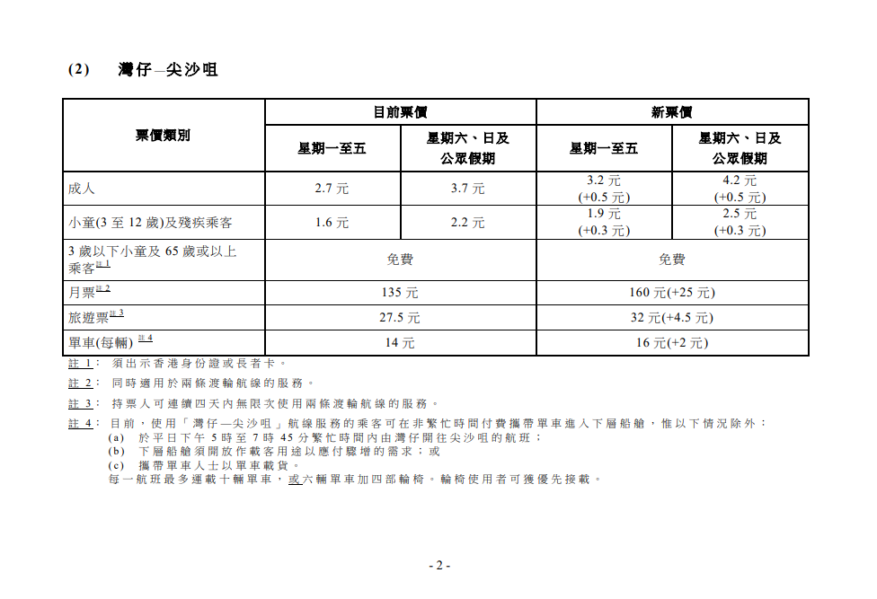 行政長官會同行政會議今日(8日)批准天星小輪旗下「中環-尖沙咀」和「灣仔-尖沙咀」兩條專營渡輪航線加價,平均加幅約為16.5%,即加3至5毫。中環航線新票價每程成人2.6至4.2元,小童1.8至2.5元;灣仔航線新票價每程成人3.2至4.2元,小童1.9至2.5元。當程序完成後,新收費將由明年2月9日開始生效。