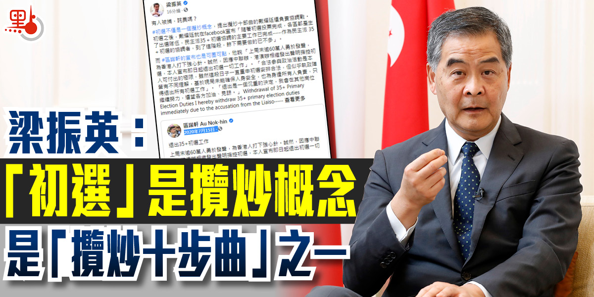 梁振英表示,「初選」是一個攬炒概念,提出「攬炒十步曲」的戴耀廷還負責協調戰。「初選」之後,戴耀廷就在facebook宣布「隨着『初選』投票完成,各區都產生了出選隊伍,反對派35+『初選』協調的主要工作已完成⋯⋯作為民主派35+『初選』的協調者,到了這階段,餘下需要做的已不多」。