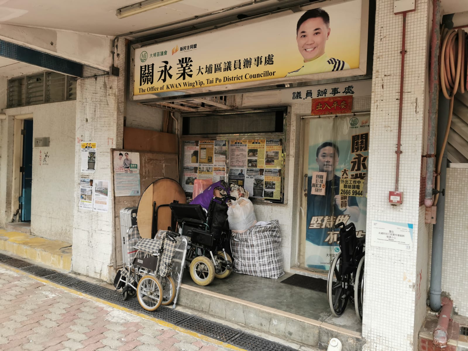 點新聞記者接到消息後,到達關永業位於大埔富善邨善群樓地下17號的辦事處了解情況,只見現場一如報料所言,有大量雜物放於辦事處門外,阻礙辦事處的布告版,雜物垃圾堆約有1米高左右,包括有陳舊的木板、多張沾有污漬的輪椅、放滿毛巾的尼龍袋,上面更有不少泛黃的舊報紙,而現場與公眾廁所相鄰。有現場受訪的居民陳先生表示,留意到辦事處門外長期放有雜物,有時會經過辦事處門口,可是都不想走近,雜物與廁所相近,令人擔心垃圾雜物為老鼠蟑螂提供藏身之處,對社區衞生帶來不良影響。