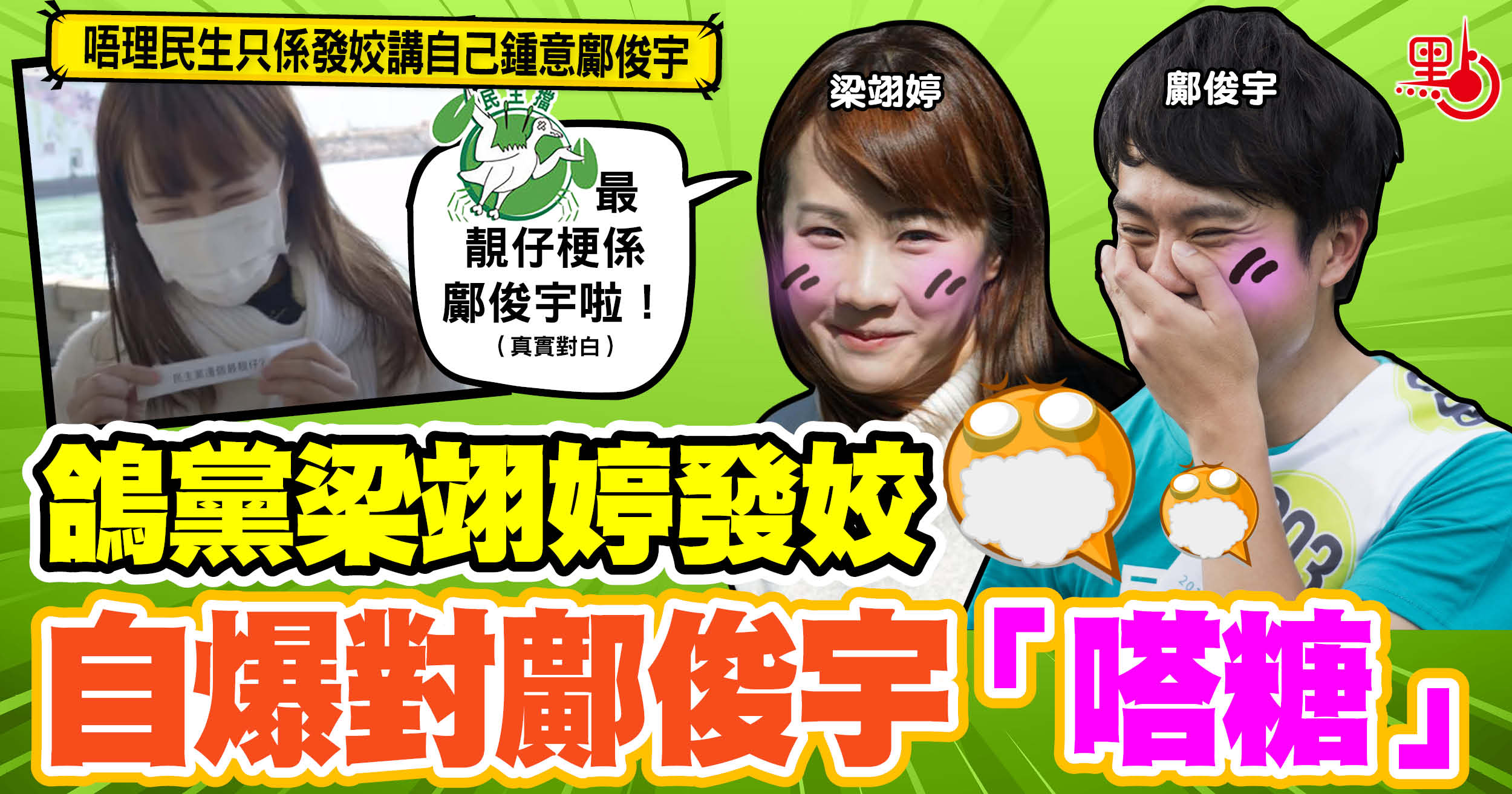 民主黨副主席、觀塘區議員梁翊婷前日搞「花臣」開設YouTube頻道,仲以民主黨邊個最靚仔作宣傳。她在片中,自爆覺得鄺俊宇係黨內最靚仔,係佢見過最聰明的男仔,又話覺得對方很浪漫很溫柔、好貫徹他的形象喎。咁又係,「愛心爆棚」的鄺俊宇,女伴不時車輪轉,梁翊婷「嗒糖」都好正常,呢啲咪叫做「姣婆遇着脂粉客」囉。