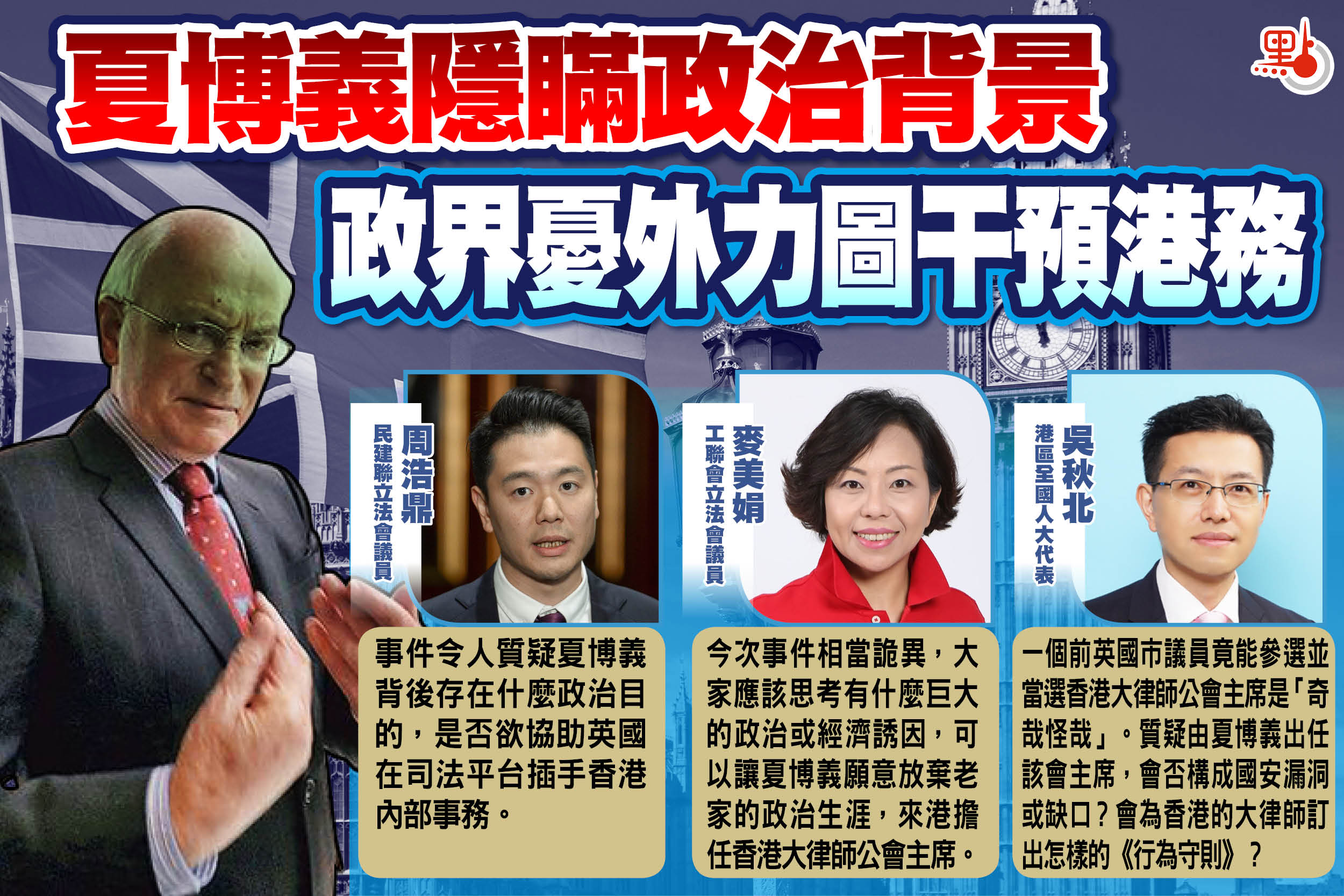 新任大律師公會主席夏博義甫上任即叫囂提出修訂香港國安法,近日更被揭發曾於2018年至2021年期間代表英國自由民主黨擔任牛津市議員,後因要出任大律師公會主席「工作量增加」,無法兼顧,才辭去市議員的職位。多名政界人士表示,一個在香港司法制度內佔重要位置的專業組織,竟由英國政客主理感到驚訝,令人質疑是否有外國政治勢力企圖借香港大律師公會的平台,插手及影響香港的內部事務,夏博義須就事件向公眾交代,更應立即辭任香港大律師公會主席,當局亦應跟進事件。
