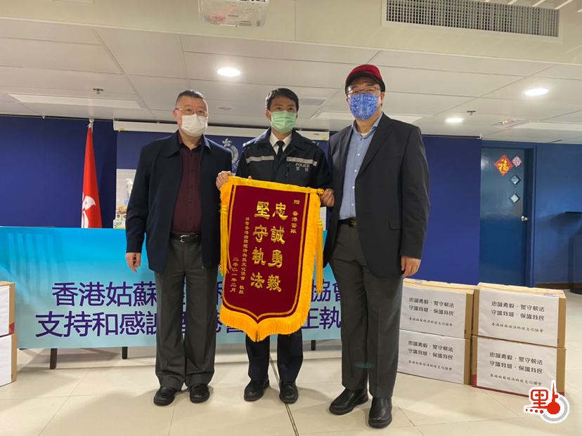 香港姑蘇經濟科技文化協會一行20人,今日(10日)下午前往九龍秀茂坪警署慰問警察,向警員致以新春的祝福,並送上寫有「堅守執法 忠誠勇毅」的錦旗,及堅果、蘋果、消毒酒精等物資,感謝他們在「止暴制亂,恢復秩序」的過程中嚴正執法,為維護香港社會穩定和市民安全作出的突出貢獻。