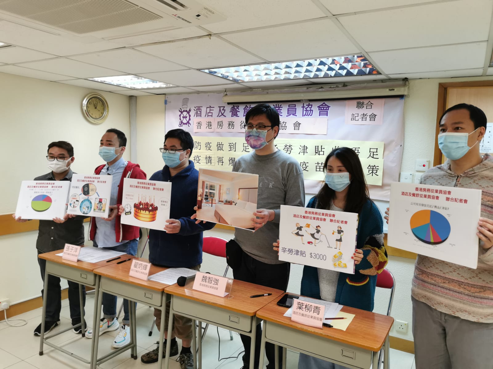 香港房務從業員協會會務主任魏智強表示,受疫情影響,加上隔離人士入住,客人在房間時間增加,令房屋的衞生情況下降,有50%房務員表示客房呈「惡劣至十分惡劣」,協會收到不少投訴及個案中有部份的房間廁所有如「公廁」,73.7%的隔離酒店房務員需要1.5-2小時以徹底清理一間房間,工作期間工友更要全副抗疫裝備以收拾房間,比平時更為辛苦,建議酒店為工友發放3000元的辛勞津貼,對工友困難情況下維持高標準的專業水平給予肯定。