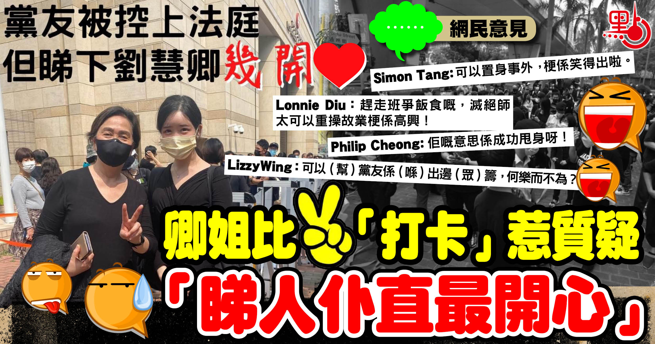 攬炒派47人被控「串謀顛覆國家政權罪」,連續數日開庭審訊,民主黨前主席劉慧卿以全黑打扮到場「打卡」。網上有一張劉慧卿同一名身穿黑裙嘅女子合照,只見劉慧卿笑容滿面,仲要比個V字手勢,心情明顯同相中後方排緊隊嘅黑衣人形成極大對比喇。
