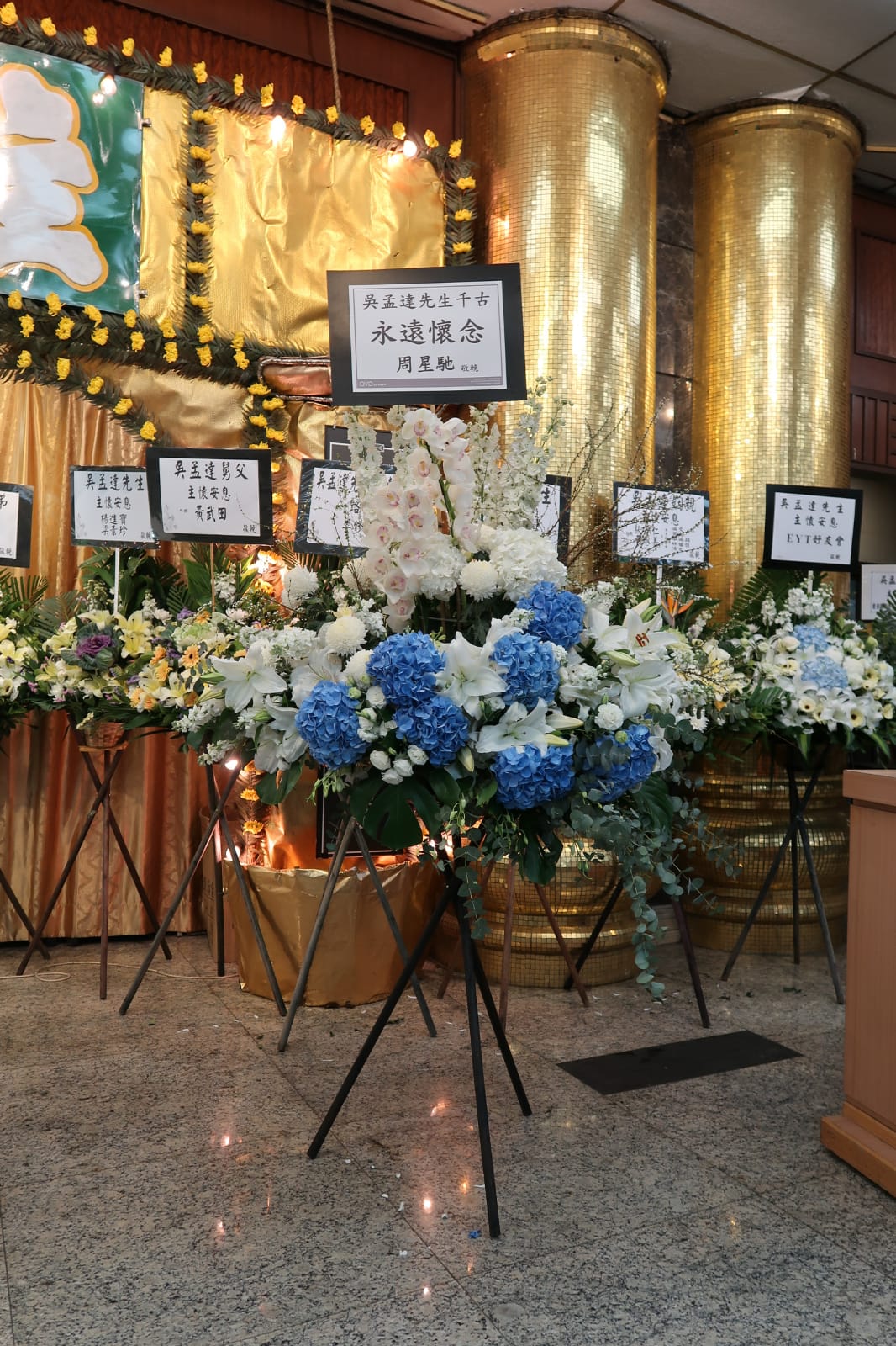 「黃金配角」吳孟達(達叔)上月27日因肝癌離世,今日(7日)在紅磡世界殯儀館地下景行堂設靈,進行基督教形式的喪禮。一眾圈中好友均送上花牌致祭,其中包括周星馳、周潤發、劉德華、成龍、黎明、郭富城、古天樂、劉青雲、楊千嬅夫婦、惠英紅等等。其中「星爺」周星馳的花牌放於家屬花牌旁的顯眼位置,備受重視。中聯辦宣文部亦有送上花牌致意。據悉,達叔明天(8日)火化後,骨灰將隨家人送到大馬,為他燦爛的影視生活寫上句號。