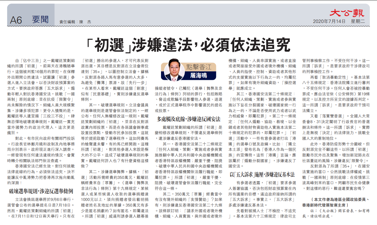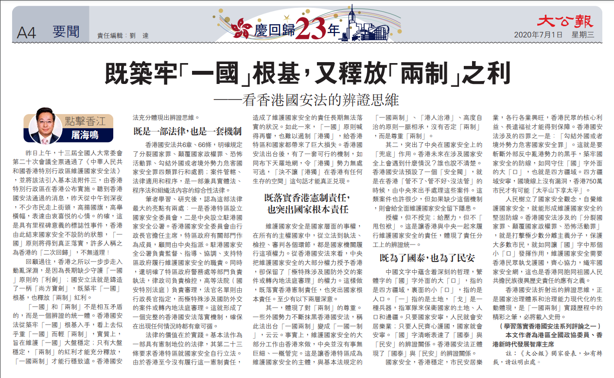 香港國安法頒布實施之時,針對反對派的無理抹黑,他在《大公報》要聞版連發三篇系列評論,從辨證思維、底線思維、戰略思維三個角度,闡釋國安法出台的重大意義。國安法實施後,攬炒派於去年7月組織策劃所謂的非法「初選」,誤導上百萬香港市民投票,他接連撰寫六篇政論文章,指出這是嚴重破壞選舉規則、涉嫌違反國安法的做法,在香港媒體中最早揭露了「初選」的違法本質。