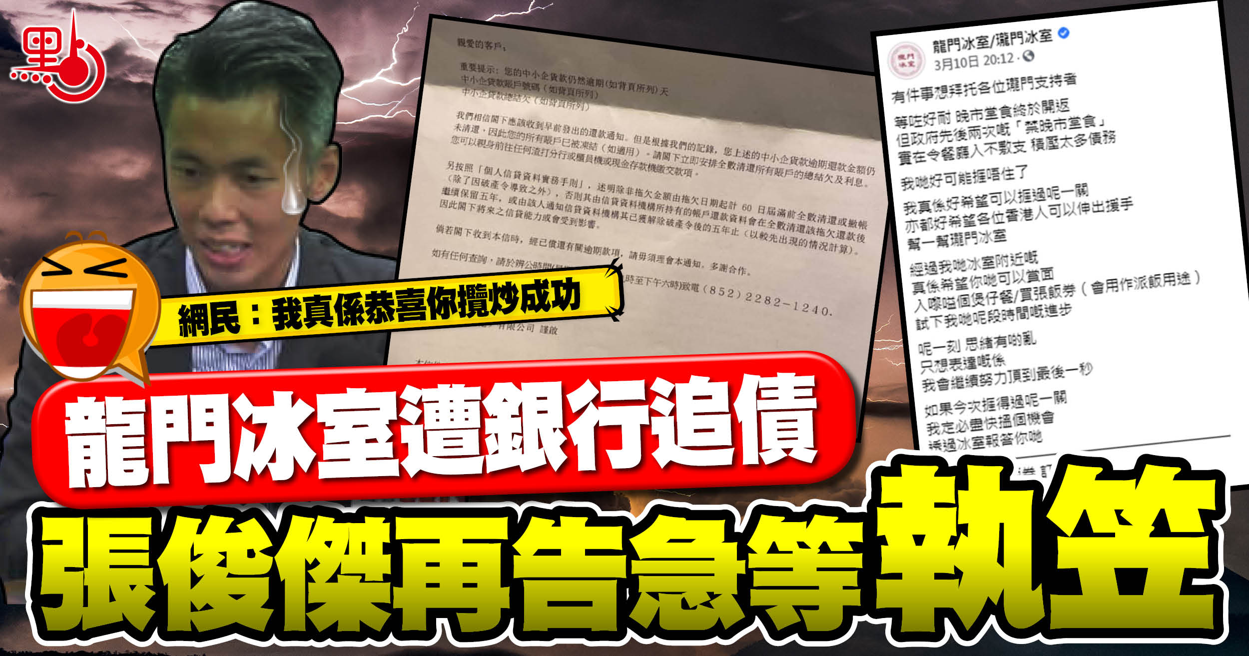 曾一度被視為「黃店」龍頭的「龍門冰室」三日唔埋兩日又嗌「告急」,大打悲情牌跪求支持者幫襯煲仔餐或購買飯券。老闆「饅頭張」(張俊傑)在其fb上傳一封渣打銀行追討欠款信件,耍賴聲稱「全數清還?我月供都攪唔掂。」