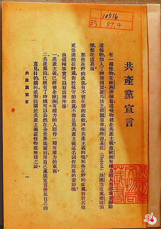 1919年9月、11月,李大釗在《新青年》上分兩期發表了《我的馬克思主義觀》。點新聞記者看到,本次展出的《新青年》六卷五號正是其中一期。這篇文章標誌着馬克思主義在中國進入較為系統的傳播階段。據介紹,1848年,馬克思和恩格斯共同起草的《共產黨宣言》在倫敦出版,這是世界上第一個共產黨組織的綱領。本次展覽展出的是1920年8月出版的陳望道翻譯的《共產黨宣言》,也是在中國最早的全譯本。