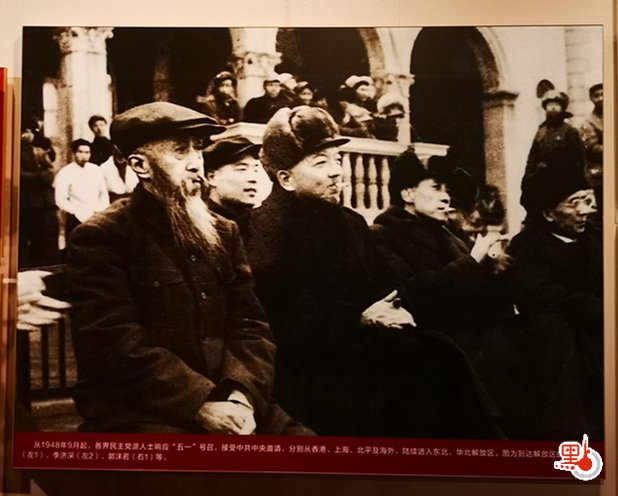 展台中還陳列了籌備新中國成立時期各界人士共議國家大事的珍貴文物,體現了各界人士團結協作、共建新中國的熱忱和深厚情誼。從1948年9月起,各界民主黨派人士響應號召,接受中共中央邀請,分別從香港、上海、北平及海外陸續進入東北、華北解放區。在一張珍貴的老照片上,可以看到到達解放區的沈鈞儒、李濟深、郭沫若等人在一起的畫面。