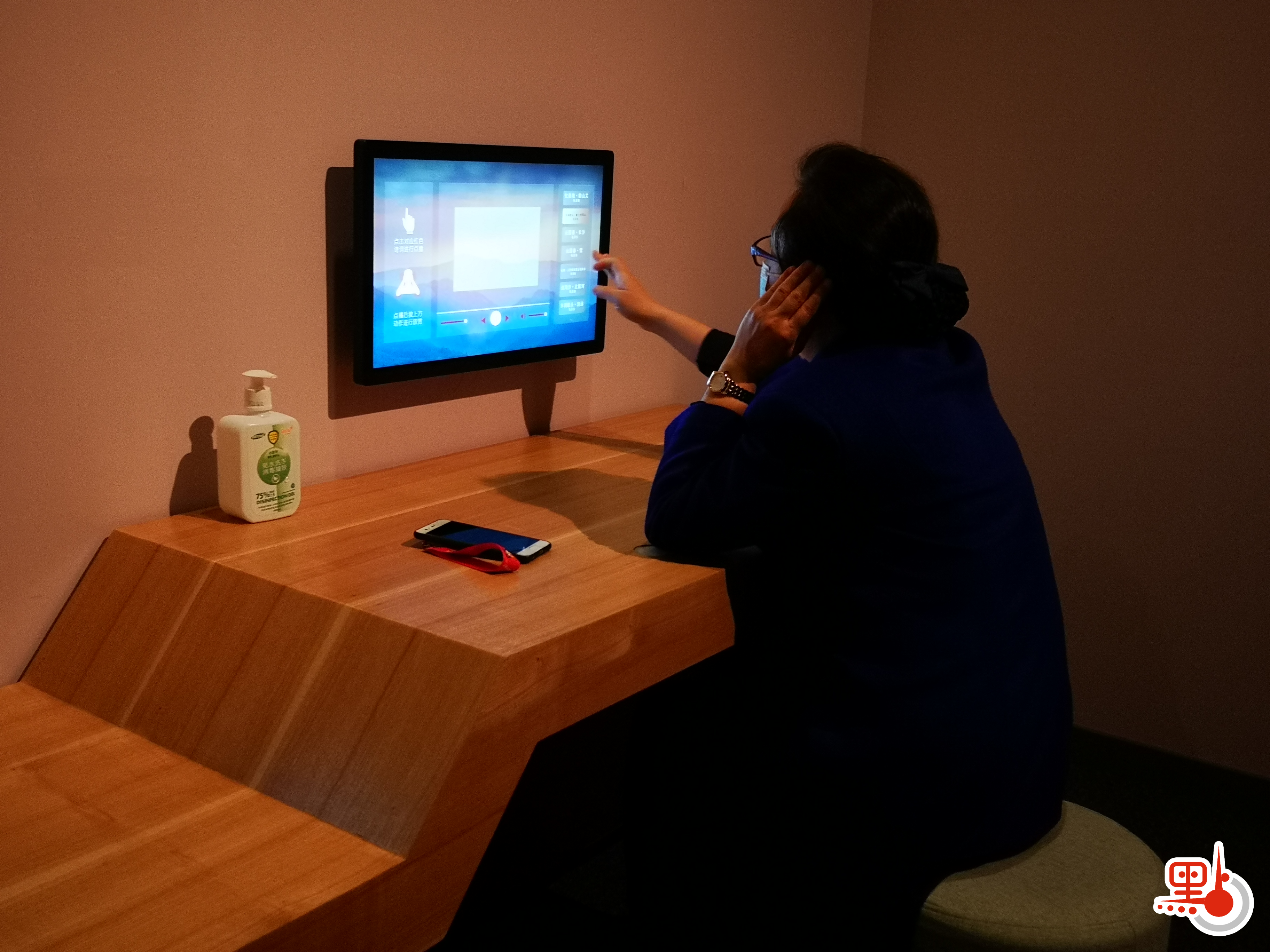在「紅色記憶經典有回聲」互動區,觀眾不僅能夠點播紅色經典歌曲,還能與紅色經典場景拍合影留念。而朗讀亭展區為了增加互動體驗,給不同身高的觀眾特別設置了一高一矮兩張桌子,觀眾坐在桌子上面用兩肘撐住支點,捂住耳朵,就可以欣賞毛澤東詩詞,並進行誦讀互動體驗。