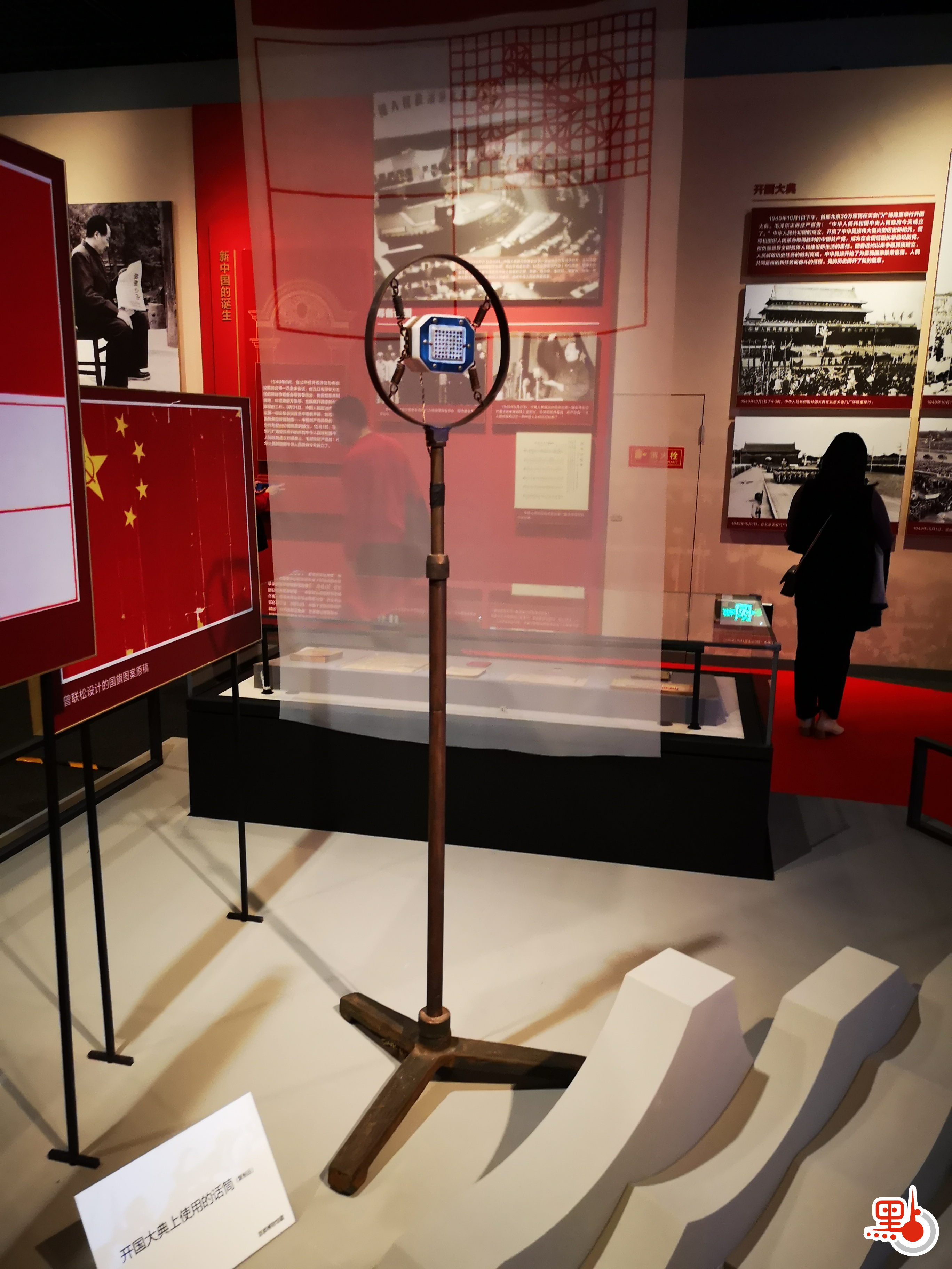 展區里,開國大典上使用過的話筒復原品和一門禮炮矗立在播放開國大典盛況的屏幕旁,與開國大典的盛況相映成輝,再加上現場的燈光、聲效,令觀眾紛紛感嘆彷彿置若其中,感慨不已。據介紹,這是開國大典上使用的禮炮復原品。在大典上,「鳴放禮炮」是重要程序之一,與升國旗、奏國歌同時,共54門禮炮齊鳴28響,表示中國共產黨領導全國人民為奪取新民主主義革命勝利而英勇奮鬥的28年。